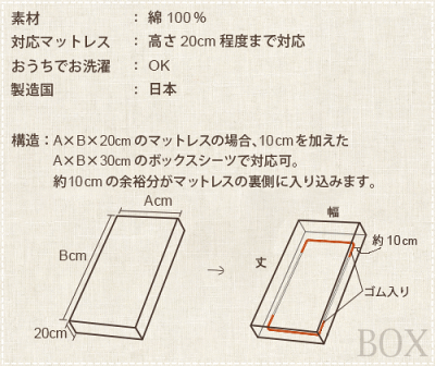 生地:コットンスムースニット 綿100% 使用:上下ゴム入り 対応マットレス:厚み約20cm迄対応可能 生産国:日本 サイズオーダー可能です。