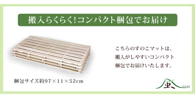 ロール式送料無料 ¥5,999円 ▼ 心地よい香りと高耐久 「檜」タイプ ▼ 四つ折り送料無料 5,980円 二つ折り送料無料 ¥7,980円 ▼ご一緒に敷布団は、いいかがでしょうか?▼軽量・高反発送料無料 6,480円洗える着脱式送料無料 7,980円制菌・極厚13cm送料無料 9,999円 仕様 サイズ 外寸:幅96×奥行き197×高さ約4cm (シングルサイズ) すのこ厚:1.3cm すのこ幅:5.1cm すのこ間隔:2.1cm 【スタッフサカシナのおすすめポイント!】・布団を湿気・結露から守るすのこマット・すのこ板に凹凸を付けた通気性抜群のリブ加工 ・すのこ枚数はぎっしり28枚!ごつごつ感を軽減 ・耐久性のあるすのこ厚1.3cm・お子様にも安心の低ホルムアルデヒド仕様・二つ折りにして布団干しも楽に!・折りたたみ固定は簡単マジックテープ式 ・キズ防止クッション付き ・搬入ラクラク!コンパクト梱包でお届け 重量 約6kg 素材 天然桐材キズ防止クッション材:EVA カラーナチュラル 梱包サイズ 約11×52×97cm 生産国中国(ISO9001認定工場で生産) 送料【送料無料(沖縄県・離島は送料別途)】※沖縄県・離島の場合はお問い合わせください。